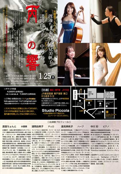 音楽は人気チェロ奏者で国内だけでなく海外でも活躍する諸岡由美子、ハープは御前演奏からkidsまで幅広く活動中の邊見美帆子、ピアノはPiano Duo framboiseでメジャーデビューの中川彩。私は水墨画のライブペイント、2x4mの迫力の大画面での揮毫。